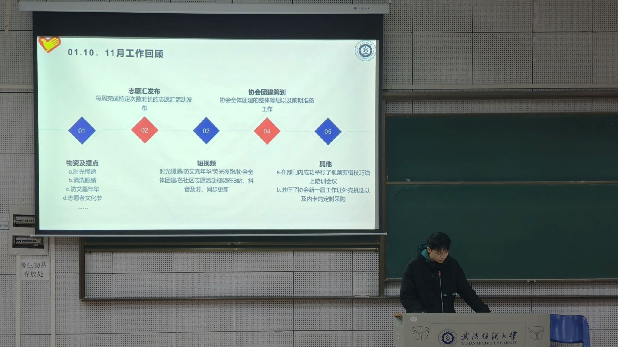 随后,各部门负责人进行了近期工作汇报——自十月中旬至今,服务队已组织开展10期“阳光领航计划”和3期“金晖助老”活动,百余名志愿者参与其中。同时,依托第八届武汉青年学生艾滋病防治健康宣传校园行项目,服务队推出了“青春无艾,以爱抗‘艾’”系列防艾宣传活动,该项目顺利获得了武汉市疾病预防控制中心和武汉市青年志愿者协会的立项支持,通过线上线下相结合的方式,在校内外同步推进九大子活动,吸引了上千名师生积极参加,反响热烈。