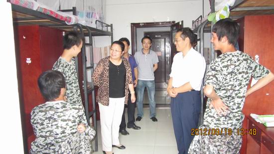 夏院长一行首先探望了营销1202班的曹杜鹃同学,她因脚部受伤而不得不中断训练,但这位坚强的女孩却仍渴望能回到训练场。夏院长和肖书记仔细地询问了她的伤势,嘱咐她好好休息。“并不一定非要在场上才能军训,你也可以通过笔把场上的感人事迹报道出来,用笔来‘战斗’!”在肖书记的安慰下,曹杜鹃开心地笑了。接着,在党员学长的带领下,夏院长一行分别走访了工管类、管工类的大部分寝室,一一询问大家入校后的情况,勉励大家克服困难,早日融入大学生活。