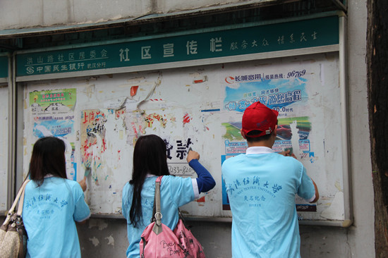 5月3日上午,由太阳集团网tyc9728阳光校区和东湖校区学生党团成员组成的志愿者服务队来到社区后并立即开展清洁服务、环保知识宣传和社区板报设计等活动。志愿者成员积极响应国家“四进社区”的号召,认真清理路段、楼道、宣传栏的牛皮癣,向居民分发讲解科教文化宣传单,在社区黑板报上用自己的灵心巧手为社区增添了青春的风采。