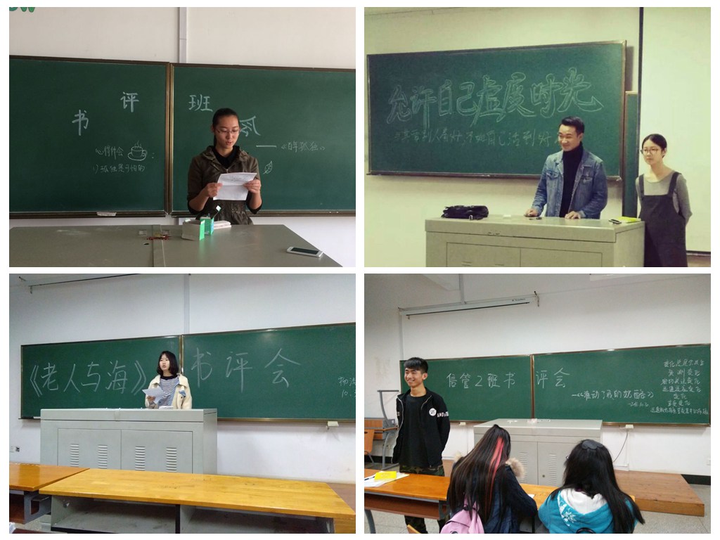 10-12月的每个月初,各班通过投票的方式在学院推荐阅读书目中选择本月书目进行精读,每月底周日晚点名后进行书评班会,活动由各班学习委员和宣传委员组织筹办;每月中旬的文艺班会则以寝室或个人为单位准备节目,各班文体委员和组织委员统筹,挑选主持人进行串词,并有小游戏进行节目串联。书评班会上,各班同学采用人物分析、段落精读、读后感、经典情节再现等方式展示着同学们一个月来的阅读成果,台上台下发言踊跃,思想新颖,内容丰富,大家分享着读书过程中所得到的感悟和思想的升华。在文艺班会中,同学们各施所长,精心准备,认真投入,为大家带来了一场场视觉的盛宴,节目中间穿插的小游戏生动有趣,同学们参与度高,班级氛围积极活跃。