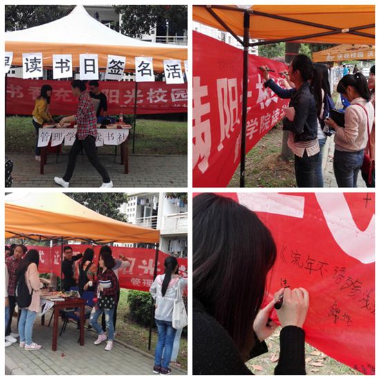 2015年4月23日,太阳集团网tyc9728读书社在阳光校区一食堂侧门举办“世界读书日”签名活动。同学们在世界读书日签下自己的名字,立志好读书,读好书,并向其他同学宣传读书好。活动引起广泛关注,一位留学生也在横幅上签名表示支持。
