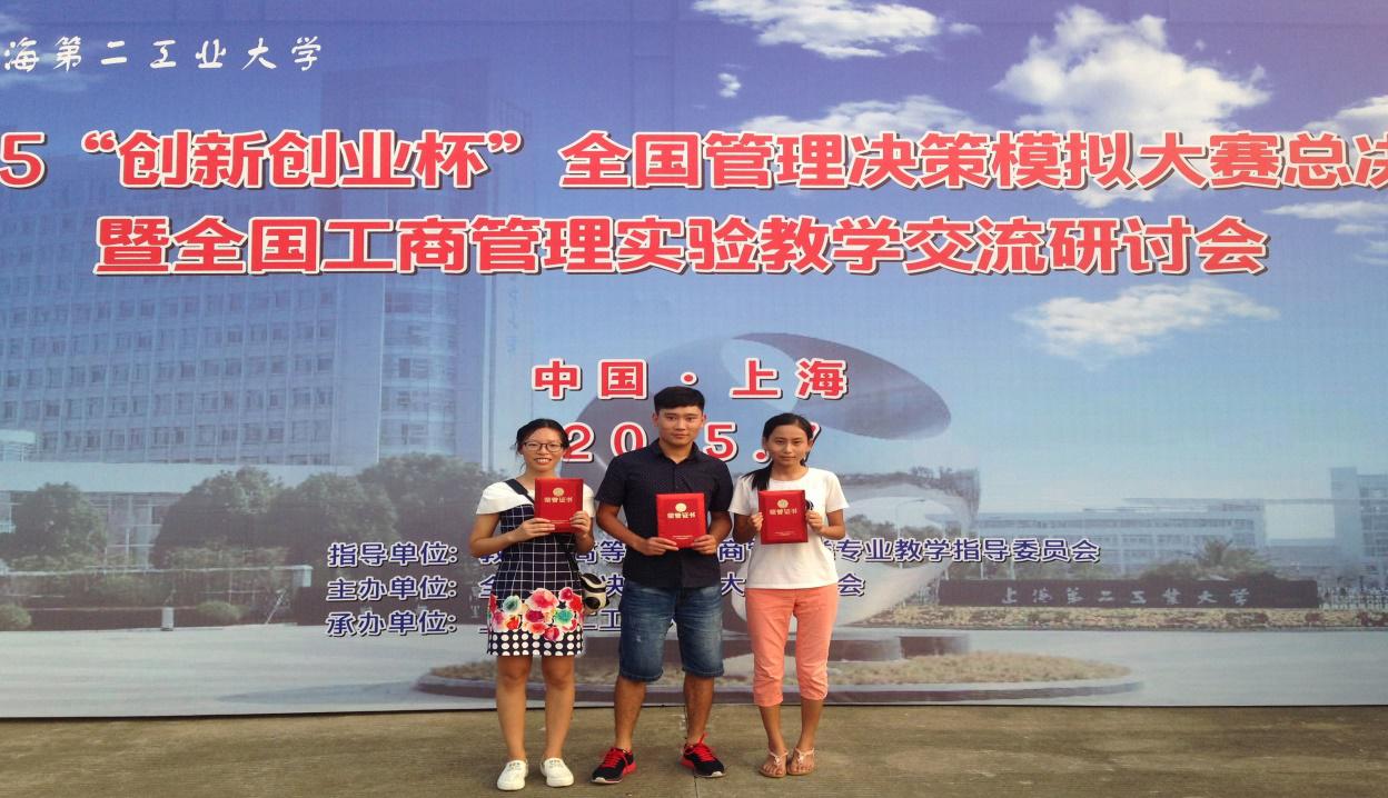 2015年7月27日,由教育部高等学校工商管理专业教学指导委员会指导、全国管理决策模拟大赛组委会主办、上海第二工业大学承办的2015年全国高校管理决策模拟大赛圆满结束。经过4个月的漫长训练和严苛的层层选拔,由我校太阳集团网tyc9728学生姜超然、彭雨霞、童安琪组成的SEE YOU AGAIN团队,与来自全国各大高校的96支代表队激烈角逐,喜获全国总决赛一等奖的佳绩。