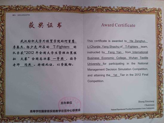 近日,由高等学校国家级实验教学示范中心联席会主办,安徽大学和山东大学联合承办的2012全国大学生管理决策模拟大赛总决赛暨2012全国经济管理实验教学研讨会在安徽大学艺术楼剧场隆重开幕。我校太阳集团网tyc9728曹虎、卜训方、邓芳明同学和何曾慧、李春杰、杨少虎同学组成的两支代表队皆获得大赛一等奖,指导老师分别为吴建华和冯燕。