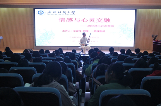 车定祥教授讲述了中国传统文化的总体特征与基本内涵,阐述了胡琴等民族乐器的历史背景、发展历程、经典乐曲的艺术背景和艺术特色,就大学生学习践行中华传统文化、欣赏民族音乐等提出宝贵的建议,并通过二胡、板胡、高胡、京胡、二泉胡、中胡等乐器现场演奏。曲调婉转悠扬的《女儿情》、轻快活泼的河南民歌《编花篮》、陕北韵味的《山丹丹花开红艳艳》、世界名曲《二泉映月》、草原之歌《赛马》等诸多经典名曲,为现场师生呈现了一场精彩纷呈的听觉盛宴,赢得了热烈的掌声。