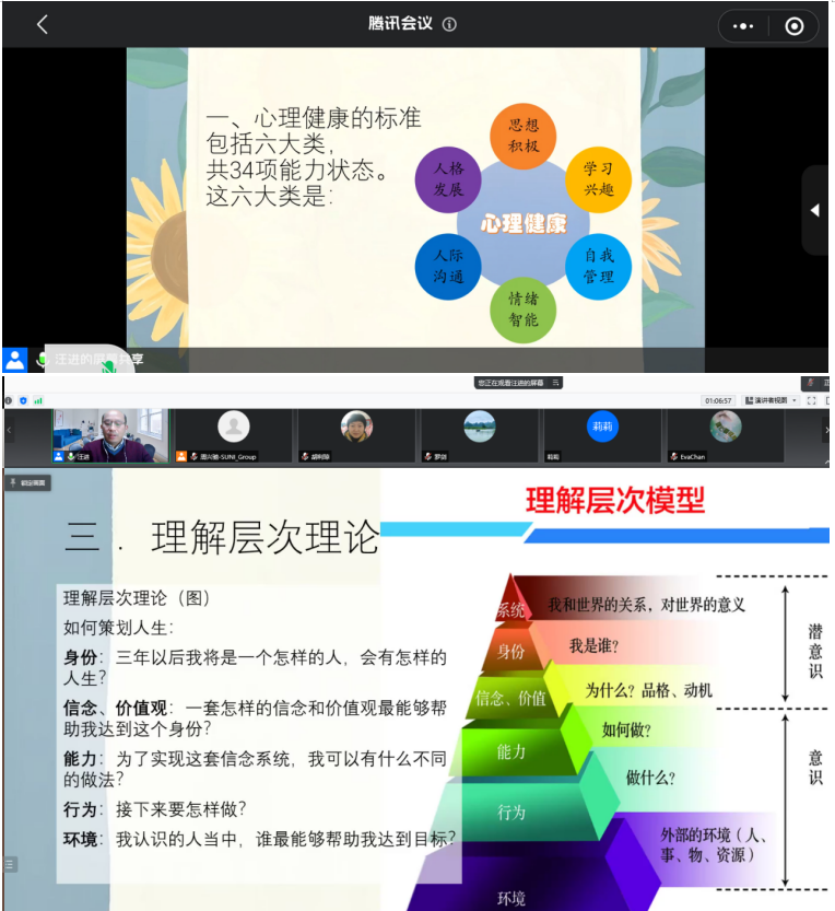 讲座开始前,周兴驰老师简单介绍了此次主讲老师,汪进老师是高级心理咨询师、高级家庭教育指导师、武汉大学人民医院精神科特聘心理专家、武汉生命之树心理咨询有限公司创办人,总督导、太阳集团网tyc9728SUNI智慧校招创业团队专家顾问。随后,汪进老师以《认识自己,做情绪的主人》为题,主要从心理健康的标准、信念系统、理解层次理论、自我意象以及情绪智能等5个方面展开阐述。汪进老师从思想、学习等角度展开,让同学们深切体会自身心理健康程度,以及改正方法。根据理解层次理论理解自我,对人生进行策划。他谈到“一个人所有的行为、情绪、举止甚至才能,永远与自我意象相一致”的观点。阐述情绪对人的重要性,让同学们认识自身情绪并且学会如何管理自身情绪。