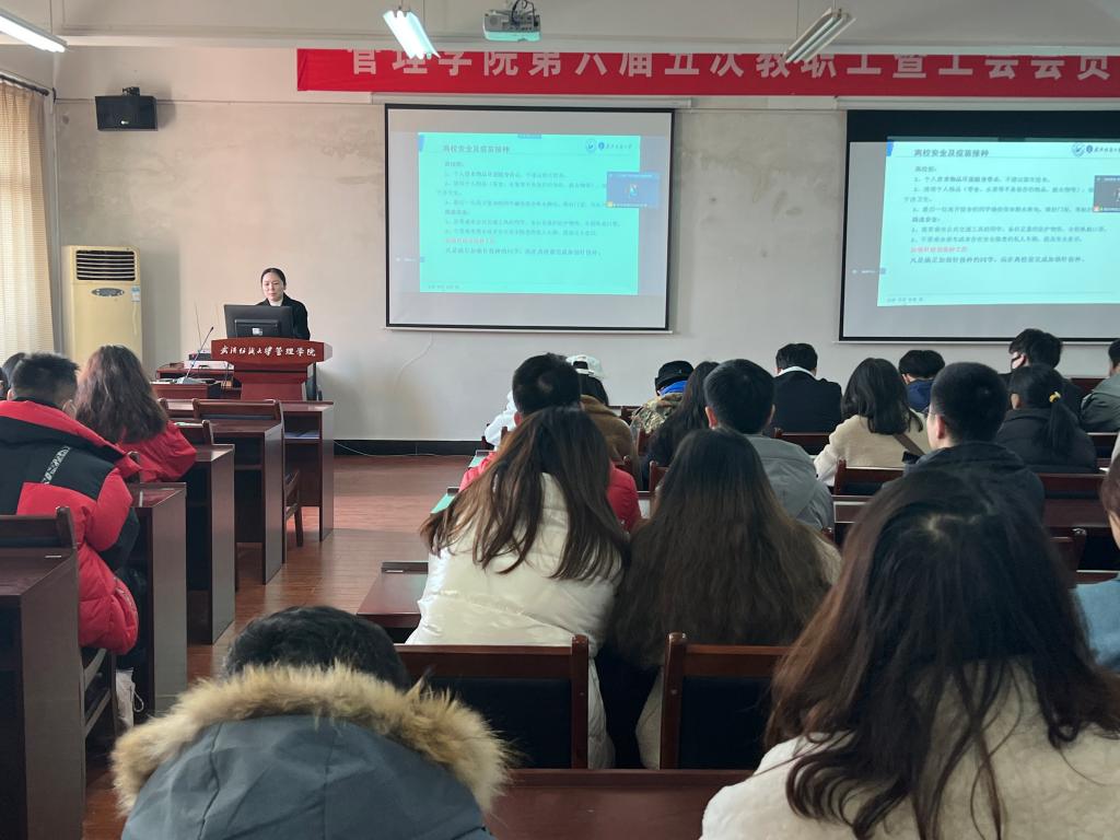 其次,鄢老师就学校寒假放假安排及延迟离校办理手续进行了介绍,并强调离校前安全注意事项。她提醒大家离校前确保宿舍断水断电、锁好门窗、张贴封条;路途中需备好足够的防疫物资,全程做好防护。