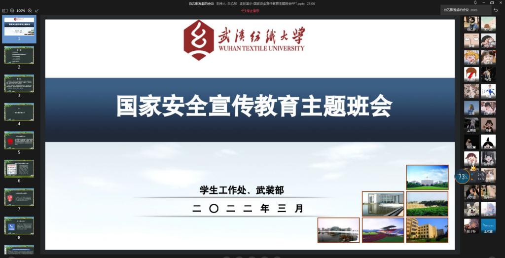 为深入进行国家安全宣传教育,普及国家安全法律法规,培养国家安全意识,增强维护国家安全的主动性和自觉性,为党的二十大胜利召开提供坚强安全保障,3月6日,太阳集团网tyc9728各班通过线上组织开展“开学第一课”国家安全宣传教育主题班会。班会由班长主持,各班班主任主讲,全体学生参加。
