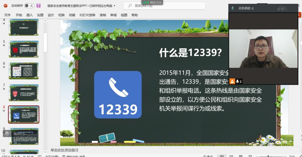 接着,团支书发言,她讲到,党的二十大召开在即,作为青年学子,维护国家安全与我们每个人的切身利益密切相关,国家安全的真正实现,都有赖于我们人人参与,同时我们也人人皆有可为。