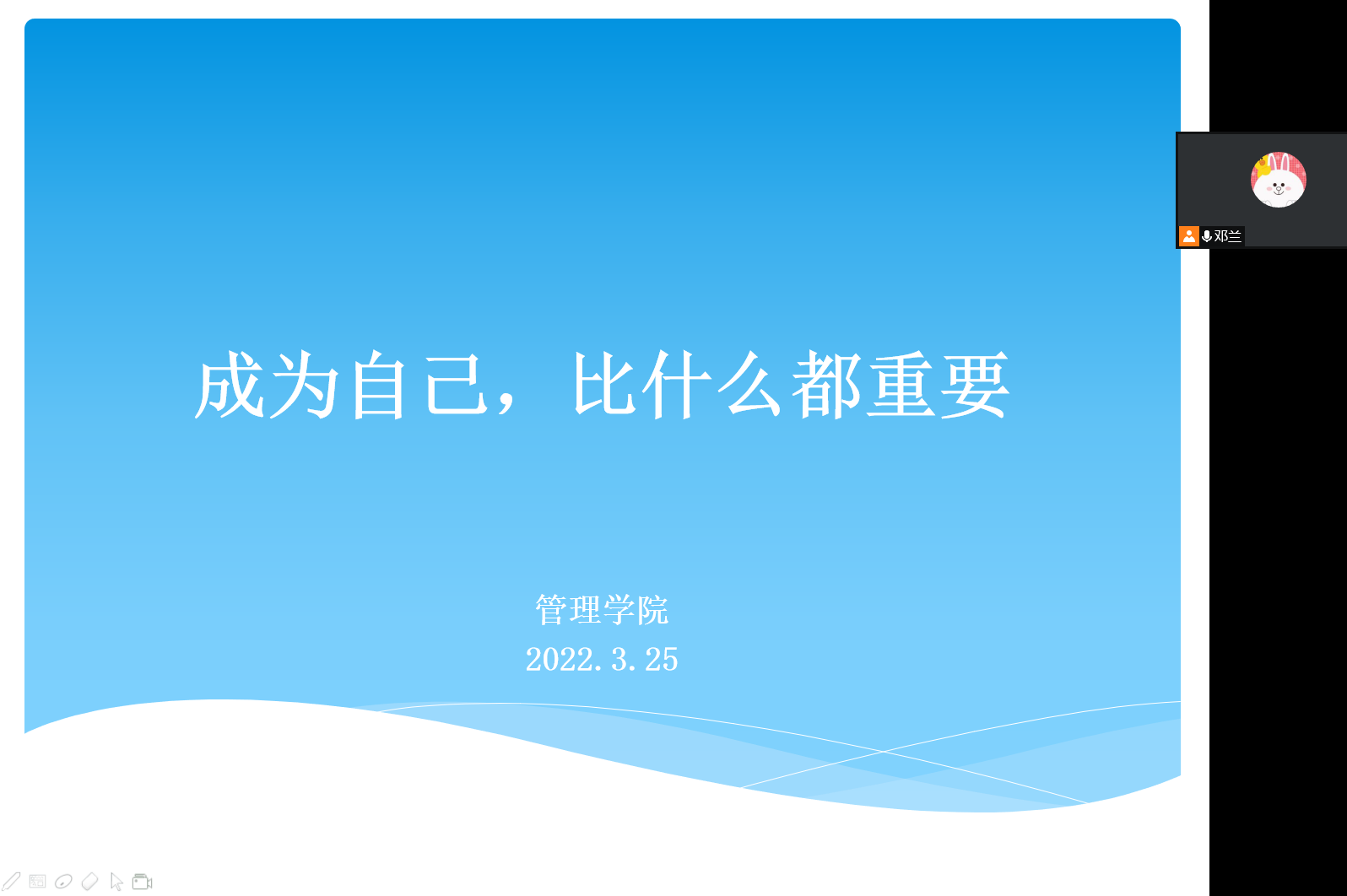 为引导我院学生善待自我、关爱自我,并以发自内心的爱与和谐来善待、关爱他人及社会,共同构建“美好纺大”,3月25日晚上6点,学院面向“阳光心语”工作站成员及学院全体心理委员,利用腾讯会议开展主题为“成为自己,比什么都重要”的心理健康教育讲座,讲座由2021级辅导员邓兰老师主讲。