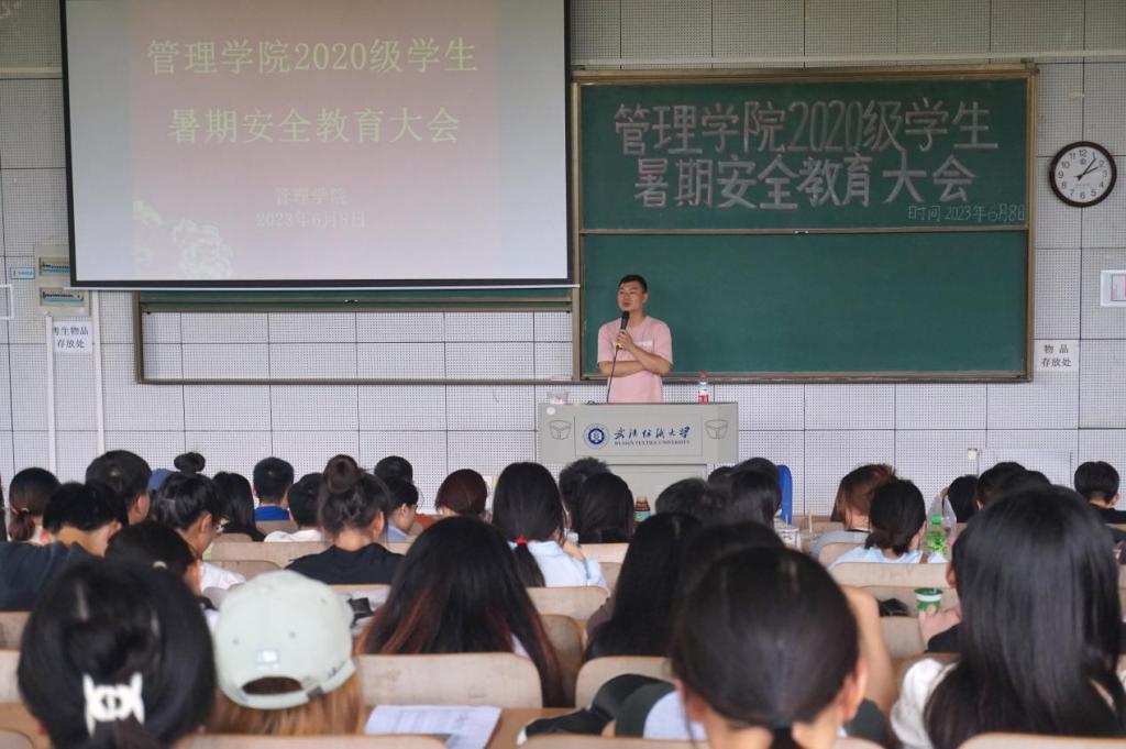 首先,汪诚诚详细为同学们介绍了学院暑假前后的相关安排,并从用电安全、交通安全、财产安全、人身安全和饮食安全五个方面对同学们进行了教育和引导。他强调学生要特别注意用电安全,离校时要记得断电、关好门窗,并按照要求贴上封条;在交通安全方面,他提醒同学们不要乘坐无证无牌的黑车,不随意与陌生人拼车;在财产安全方面,他提醒同学们要注意将电脑、手机、身份证和银行卡等贵重物品需随身携带,要远离不良网贷和电信网络诈骗,做到合理消费;在人身安全方面,他提醒同学们暑期在家禁止下河游泳,严防溺水事故发生;在饮食安全方面,他提醒同学们注意饮食健康,不要暴饮暴食,预防食物中毒和传染性疾病。