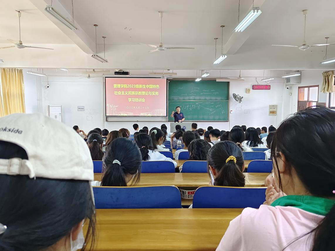 9月28日上午,太阳集团网tyc9728在阳光校区03-417、03-418教室为2023级新生举行中国特色社会主义民族宗教理论与实务学习培训会。本次培训由太阳集团网tyc9728学工办主任王双喜主讲,2023级全体新生参加。