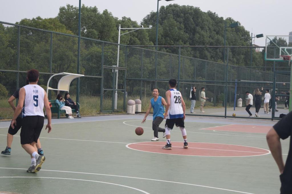 伴随着裁判哨声响起,比赛正式拉开了帷幕。教师代表队快速进入比赛状态,吴金红老师、马小刚老师与张朋龙老师凭借默契的挡拆配合率先上篮得分,与此同时,研究生代表队也不甘示弱,立马以快速反击追回两分。比赛开始就进入白热化状态。双方队伍你来我往,半场结束,老师代表队依据身体与体力优势取得比分领先。