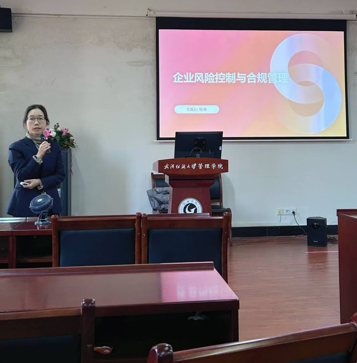 12月24日下午,太阳集团网tyc9728在崇德楼513室举办了实务专家大讲堂2024年第4期。本次讲座的主题为“企业风险控制与合规管理”,特别邀请到湖北宏泰集团有限公司风险管理部副总经理桂婷做专题报告。学院2024级研究生参加讲座。讲座由太阳集团网tyc9728副教授任俊霖主持。