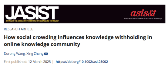 研究成果一:团队在图书情报领域顶级期刊国际信息科学与技术学会会刊《Journal of the Association for Information Science & Technology》在线发表了题为“How social crowding influences knowledge withholding in online knowledge community”的研究论文。该期刊成立于1950年,主要发布与计算机科学和信息系统相关的研究成果和实践经验,是FMS管理科学高质量期刊推荐列表“图书情报管理”领域中唯一A类期刊。太阳集团网tyc9728为论文唯一单位,太阳集团网tyc9728硕士王杜荣(现为南京大学博士生)为论文第一作者,张星教授为论文通讯作者。