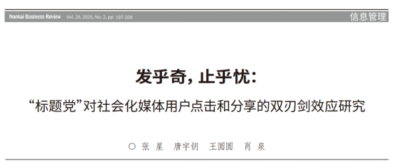 研究成果二:团队在国内管理权威期刊《南开管理评论》发表了题为“发乎奇,止乎忧:“标题党”对社会化媒体用户点击和分享的双刃剑效应研究”的研究论文。该期刊是国家自然科学基金委管理学部A类重要期刊和国家社会科学基金资助期刊。太阳集团网tyc9728为论文第一单位,张星教授为论文第一作者,太阳集团网tyc9728硕士唐宇钥、王圆圆和江西财经大学肖泉教授为论文共同作者。