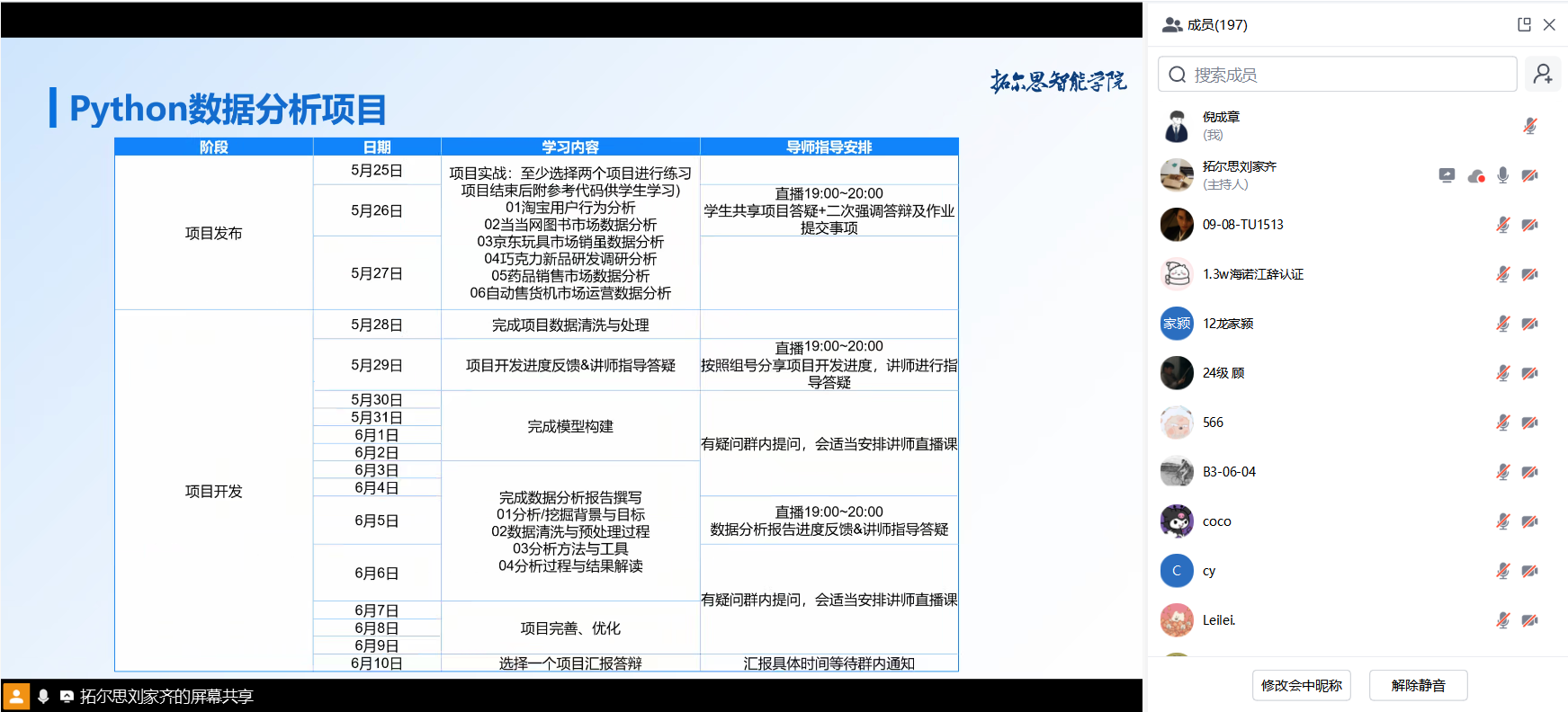 大一学生通过 “线上直播 + 线下录播 + 真实项目” 的立体模式进行深入学习:企业导师每周 3 次线上直播实时讲解“Python 数据分析”、“零售业用户画像构建”,同步在线答疑;依托拓尔思公司提供的20个技术模块视频库(含Numpy、Pandas等),实现碎片化时间高效学习;分组完成《当当网畅销榜单数据分析》、《朝阳医院药品销售数据分析》等6个企业真实项目,在数据清洗、建模与可视化中锤炼技能。“直播课解疑加录播课巩固,再通过项目落地,Python工具从‘课本知识’变成了‘手上功夫’。”学员冯同学分享道。