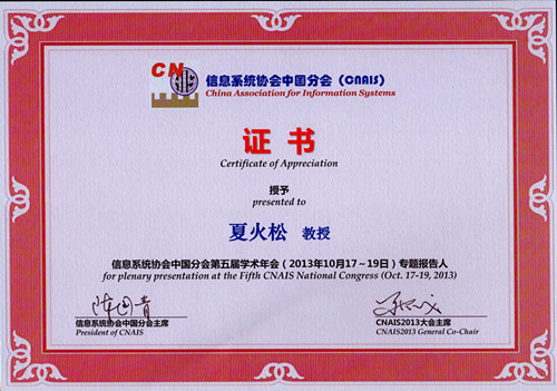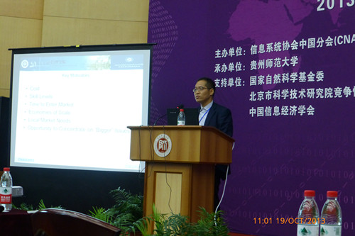 近日,国际信息系统协会中国分会第五届学术年会(CNAIS2013)在贵州师范大学召开,大会邀请了国际知名的Paulo Goes教授(MIS Q 主编,University of Arizona),国际期刊ECRA联合主编、美国伊利诺伊大学芝加哥分校的Christopher Westland教授作了特邀报告,共有国际、国内专家学者约400人参加了会议。本次大会的主题为“大数据背景下的信息系统研究与实践”。 我校太阳集团网tyc9728夏火松院长、教授应邀出席了会议。