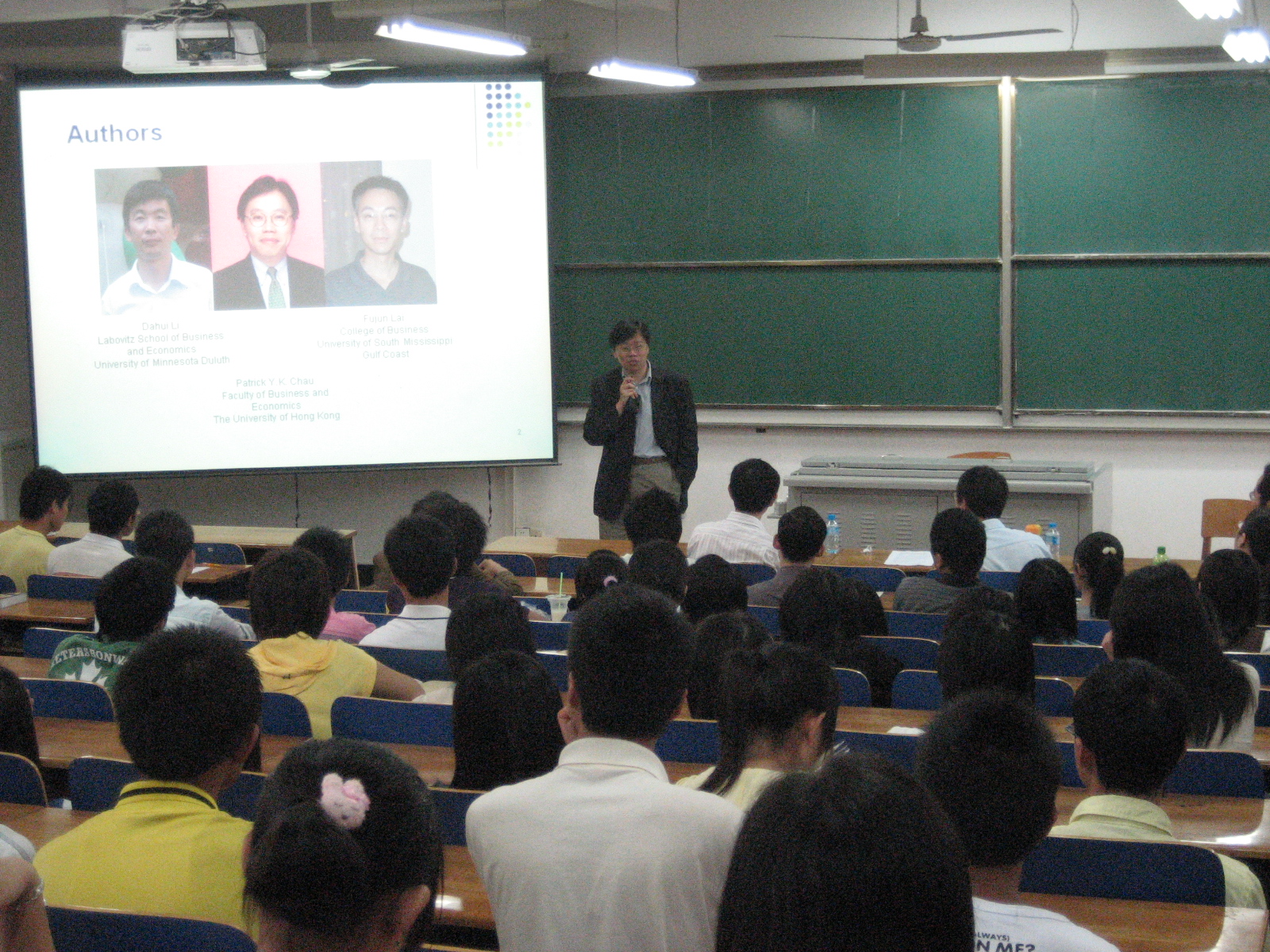 Dr Chau结合中国内陆公司的实际案例从研究背景、研究问题、文献回顾、研究模型和假设、研究方法、数据收集、数据分析和结果、讨论和局限、启示和结论等方面进行了讲解。 Dr Chau在讲座前还饶有兴趣地和同学们畅谈了他心中的香港和香港大学,他的讲座生动、知识新颖,他的职业精神和研究理念感染了在场的每一位师生。
