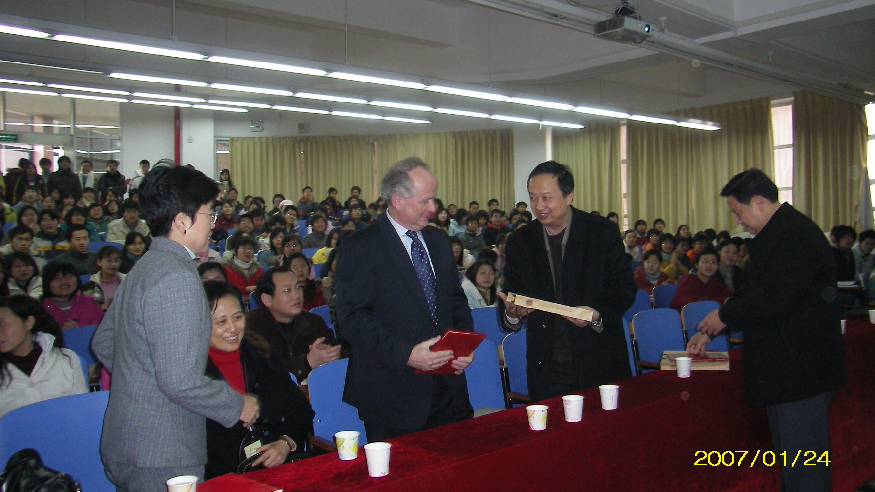 聘用仪式过后,Heiner Flassbeck博士用他渊博的经济学知识和丰富的实践经验向同学们介绍了当前非常前沿的国际经济理论观点,主要论述了富国与穷国之间的经济发展不平衡、富国与穷国如何在经济全球化的时代背景下加强合作以及我国的汇率和人民币升贬值的问题。他还强调就目前我国的各项经济指标参数来说看不到任何金融风险,特别对我国能够抢占德国手机和纺织品市场大加赞许!李月芬教授流利精彩的即时现场翻译也给我校师生留下了深刻印象。