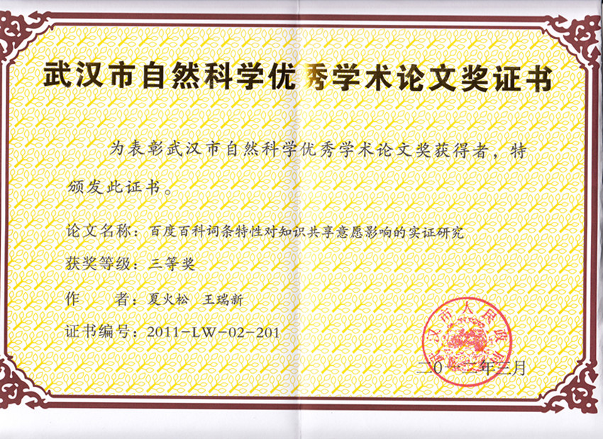 近日,从武汉市政府奖励办公室获悉,我校太阳集团网tyc9728夏火松教授论文《百度百科词条特性对知识共享意愿影响的实证研究》喜获第二届武汉市人民政府自然科学优秀学术论文奖三等奖。