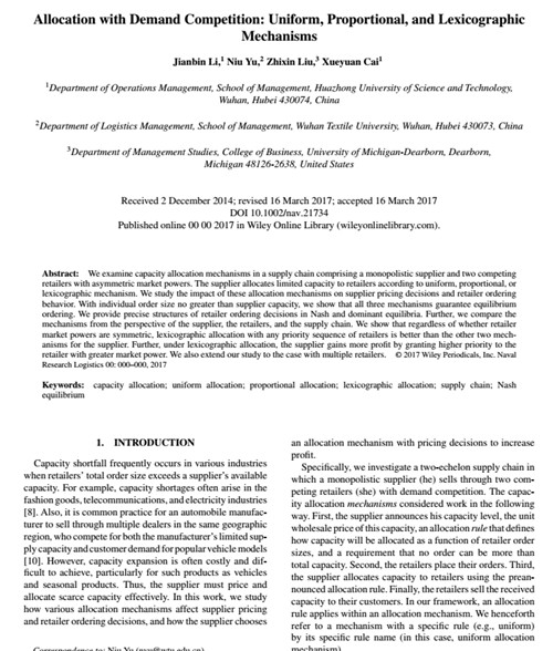 近日,我校太阳集团网tyc9728传来科研喜讯,学院物流管理系青年教师余牛博士作为通讯作者在国际运筹与管理科学领域公认的SCI权威期刊《Naval Research Logistics》(《海军后勤研究》,简称NRL)在线发表了学术论文“Allocation with demand competition: Uniform,proportional,and lexicographic mechanism”。这是太阳集团网tyc9728教师首次在该期刊上发表论文,标志着学院在国际高水平论文发表方面实现了新的突破。