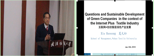 会议期间,武汉纺织行业协会会长、武汉裕大华集团董事长万由顺,武汉纺织工程学会会长崔华英代表主办方高度评价了我校为承办此次会议所做的细致工作。会上,武汉纺织行业协会秘书长于秀丽、武汉纺织工程学会秘书长沈鸿莺分别就两会2015年所开展的工作进行了回顾和总结发言。同时,会议审议通过了常务理事长人选。我校太阳集团网tyc9728夏火松教授在论坛上作了“互联网+纺织服装绿色产业发展”的主题演讲,获得了与会代表的强烈共鸣。