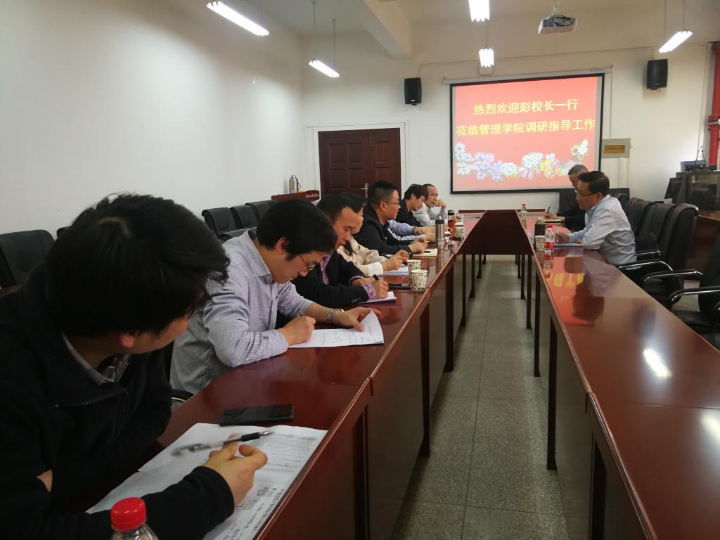 4月16日下午,校长彭育园来到太阳集团网tyc9728,对学院当前改革发展等各项工作情况进行调研,与学院领导班子成员和教师代表座谈交流。学校办公室相关负责人参加了调研活动。