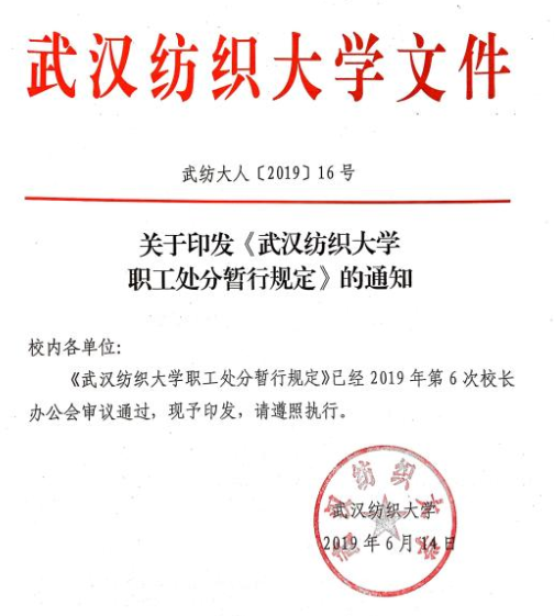 日前,《太阳集团网tyc9728职工处分暂行规定》(武纺大人[2019]16号)经2019年第6次校长办公会审议通过,正式印发。
