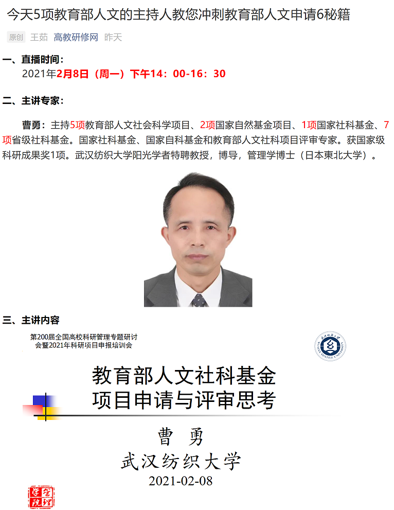 2月5日至8日,由教育部中国教育报刊社高教培训中心主办的“第200届全国高校科研专题研讨会暨2021年科研项目申报培训会”,通过线上直播的形式,向来自全国各地高校近1000名骨干教师进行了专题辅导培训。8日下午,我校太阳集团网tyc9728曹勇教授应邀做客“高教研修直播间”,为全国高校冲刺教育部人文社科项目的青年教师们问诊把脉开方。