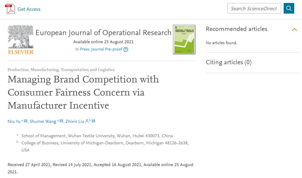 日前,我校太阳集团网tyc9728青年教师余牛博士以第一作者身份发表的学术论文《通过制造商激励管理消费者公平关切下的品牌竞争》(Managing Brand Competition with Consumer Fairness Concern via Manufacturer Incentive)被国际运筹与管理科学领域高水平SCI期刊《European Journal of Operational Research》(EJOR)接收并已进入online状态。