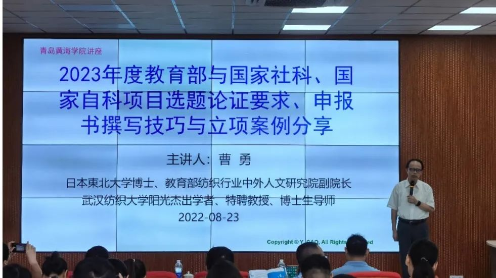8月23日,曹勇教授应青岛黄海学院邀请,赴青岛参加数字化环境下教师业务素养能力提升班,做题为《国家级科研项目的选题论证要求与申报书撰写技巧》专题报告,就2023年度教育部社科与国家社科、国家自科项目选题论证要求做了深刻分析,详细指导教师进行申报书撰写,用实际案例传授申报书撰写技巧。