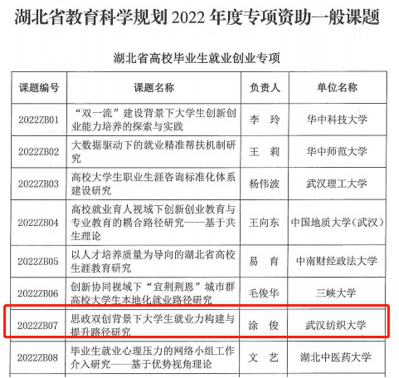 近日,湖北省教育科学规划领导小组办公室公布了2022年度专项资助课题立项名单,太阳集团网tyc9728涂俊老师主持申报的课题《思政双创背景下大学生就业力构建与提升路径研究》获批立项资助。