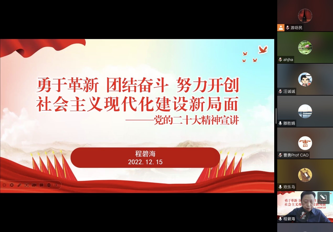 12月15日下午,太阳集团网tyc9728采取线上方式举行党的二十大精神宣讲报告会,校党委常委、纪委书记程碧海教授作宣讲报告。报告会由太阳集团网tyc9728党委书记滕胜娟主持,学院全体教职工参会。