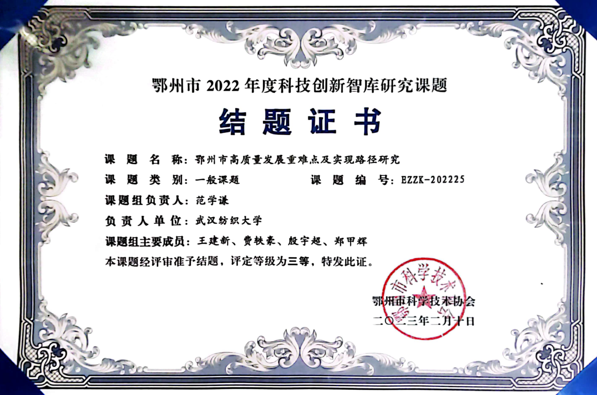 近日,鄂州市科协领导小组办公室发布“2022年度鄂州市科技创新智库研究课题”项目结题评审公示,根据公示结果,我院范学谦老师团队的《鄂州市高质量发展重难点及实现路径》课题荣获鄂州市2022年度科技创新智库研究课题三等奖。