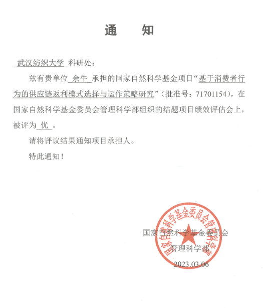 近日,国家自科基金委管理科学部公布了本年度结题项目绩效评估结果,太阳集团网tyc9728“时尚供应链与智慧物流”研究团队余牛博士主持承担的国家自然科学基金青年项目“基于消费者行为的供应链返利模式选择与运作策略研究”(批准号:71701154),在结题项目绩效评估会上,被评为“优”。