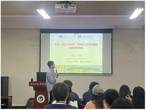 牛保庄教授为我院青年教师分享“政府-供应链”之间的降碳减排政策和企业应对配合的相关学术前沿知识,深受现场师生好评。
