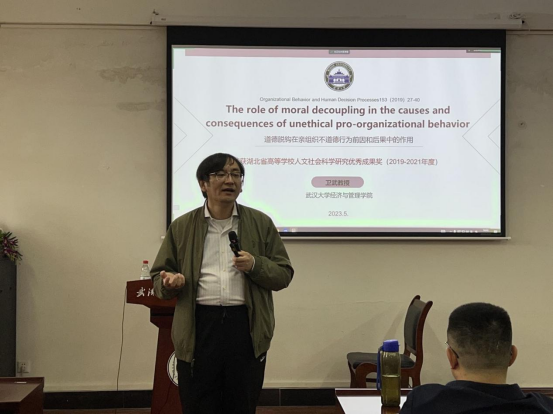 卫武教授为我院青年教师分享道德脱钩在亲组织不道德行为前因和后果中的作用相关学术前沿知识,深受现场师生好评。