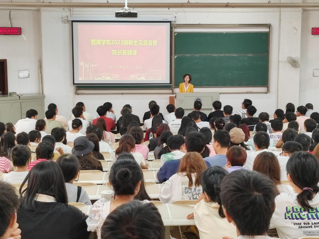 在自由提问环节,2023级新生踊跃提问,吴金红以及在场老师倾囊相授。在“管理学科报考热和社会管理岗位有限”这一问题上,吴金红认为当今企业和学校提供了大量的管理岗位,我们大学生要做的是在不断提升自我能力的同时,调整目标期望、匹配岗位要求。在新生谈及对物流专业的研究方向以及就业前景困惑时,吴金红通过列举身边实例来解释智慧物流的重要性以及其涉及面广的特性,指出其就业前景十分明朗。不仅如此,他通过解释自己的研究方向,解答了新生关于大数据管理与应用专业定位的疑惑。杨筝博士就衡量好学生和好老师的标准提出看法——好学生是需要结合个人情况在某一兴趣领域深耕,好老师则是可以和学生打成一片的。张飞则建议2023级新生提前了解学科竞赛并主动参与其中,鼓励学生在大学期间“读好一个专业,培养一个专长,参加一个竞赛,做好一个项目,锻炼好一个身体”。