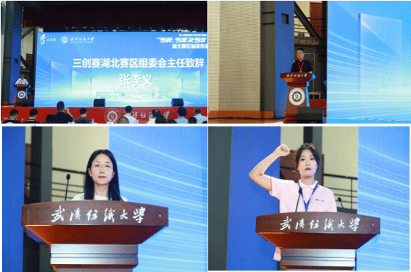 三创赛湖北赛区组委会主任张李义教授为开幕式致辞,三创赛组委会副秘书长毛志斌教授进行了大赛规则和纪律说明,评委代表彭玲老师代表评委宣誓;参赛选手代表带领全体参赛选手起立宣誓。