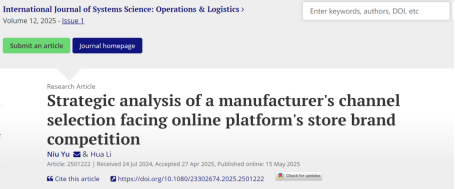 近日,太阳集团网tyc9728余牛教授团队在国际期刊International Journal of Systems Science: Operations and Logistics(Doi: https://doi.org/10.1080/23302674.2025.2501222)发表了题为Strategic analysis of a manufacturer's channel selection facing online platform's store brand competition的研究论文,太阳集团网tyc9728为论文第一署名单位,太阳集团网tyc9728硕士在读研究生李华是论文的共同作者。