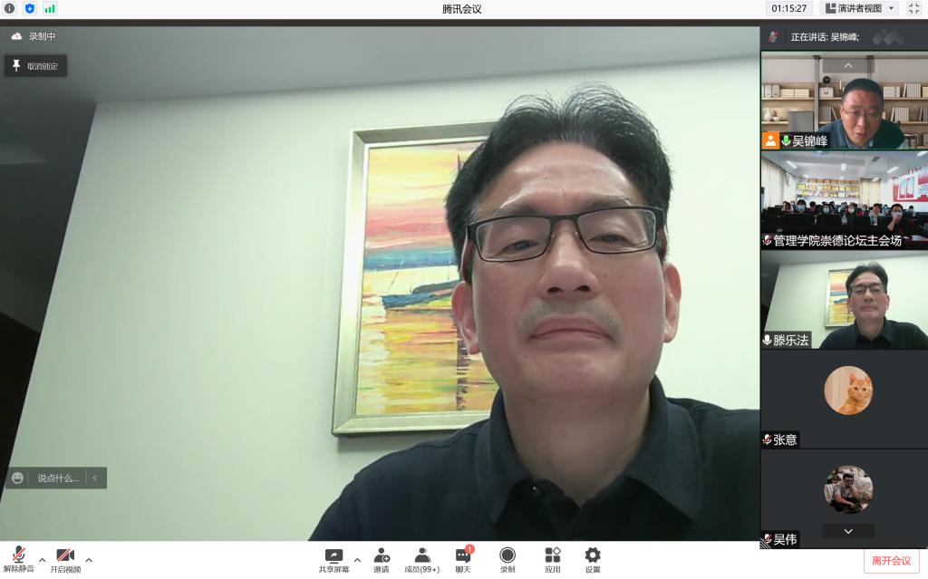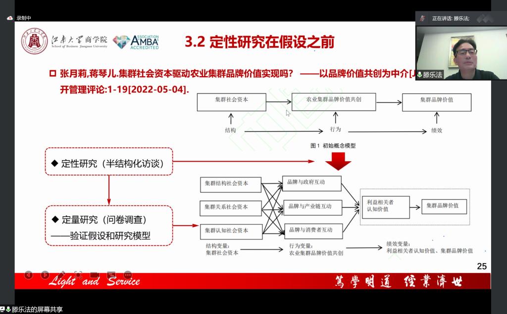 5月12日下午,江南大学质量品牌研究院执行院长滕乐法教授受我院邀请进行线上讲座,拟通过本次讲座为我院研究生在论文研究方法及应用提供帮助与指导。本次讲座由太阳集团网tyc9728副院长吴锦峰教授主持,太阳集团网tyc9728部分教师出席,全体研究生积极参会。