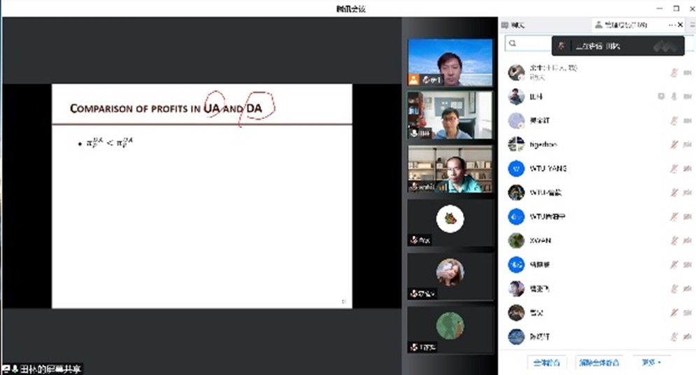 在自由交流环节,相关教师和学生们踊跃提问,田林教授一一给予了耐心细致的解答,特别针对模型的设置、消费者效用函数的构建、模型与实际的结合等问题与我院师生进行了热烈的讨论。最后,余牛教授对本次讲座内容进行总结,并再次表达了对田林教授的感谢,讲座圆满结束。