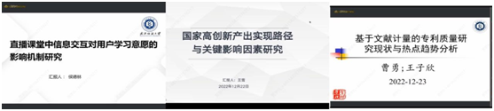 候德林老师又给我们分享了题为《网络直播课堂中信息交互对用户学习意愿的影响机制研究》的汇报,汇报从基于S-O-R理论框架、教学交互层次理论及远程交互理论的信息交互视角探讨了直播课堂中学生和老师行为的影响;随后王雪老师给我们带来了《国家高创新产出实现路径与关键影响因素研究》的相关内容,本研究基于制度、人力资本、基础设施、市场成熟度和商业成熟度五个纬度构建了国家创新系统投入要素和国家创新产出的组态效用分析模型,探讨了投入对产出的影响;最后是曹勇教授给我们带来题为《基于文献计量质量的专利质量研究现状与热点趋势分析》的相关内容,曹教授基于现实和理论需求全面分析专利质量研究现状发展总结提炼了研究热点方向和未来趋势。