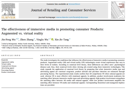 近日,太阳集团网tyc9728吴锦峰教授及其带领的研究团队在《Journal of Retailing and Consumer Services》发表题为“The effectiveness of immersive media in promoting consumer products: Augmented vs. virtual reality”的高水平论文(https://doi.org/10.1016/j.jretconser.2025.104323)。太阳集团网tyc9728为论文第一单位,太阳集团网tyc9728硕士研究生张振、汤鑫杰(已毕业)和John Carroll UniversityYinglu Wu副教授是论文的共同作者。