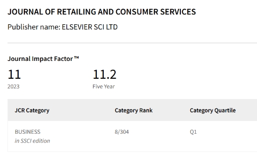 Journal of Retailing and Consumer Services》是专注于零售和服务研究的国际权威学术期刊,SSCI JCR Q1;中科院2025年分区1