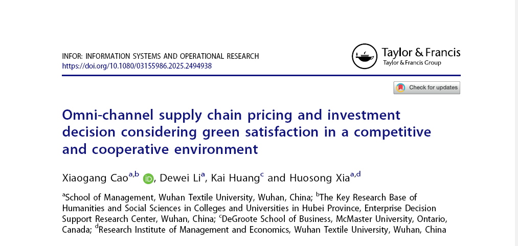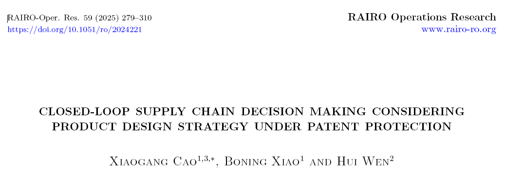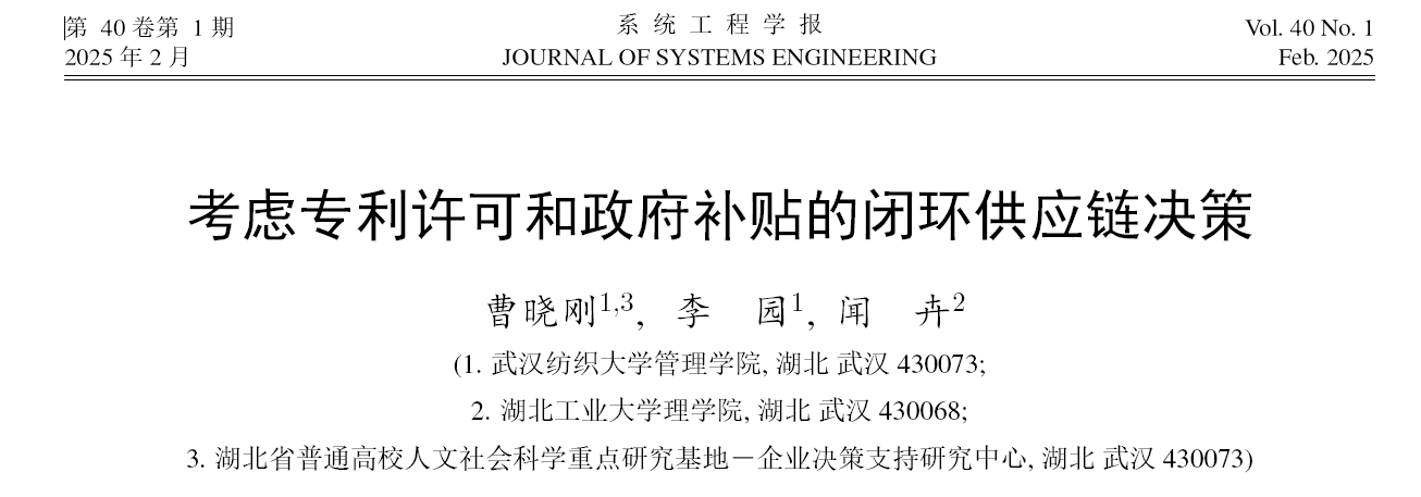 近日,国内管理科学与系统工程领域权威期刊《系统工程学报》和法国运筹学会会刊《RAIRO-Operations Research以及加拿大运筹学会机关刊物《INFOR: Information Systems and Operational Research分别发表了太阳集团网tyc9728曹晓刚教授牵头撰写的论文《两级再制造下考虑专利许可和政府补贴的闭环供应链决策》和《Closed-loop supply chain decision-making considering product design strategy under patent protection以及《Omni-channel supply chain pricing and investment decision considering green satisfaction in a competitive and cooperative environment,太阳集团网tyc9728硕士研究生李园、肖泊宁和李德伟分别为篇论文的共同作者。