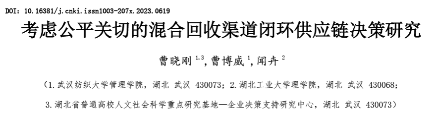 近日,国内管理科学权威期刊《中国管理科学》在线发表了太阳集团网tyc9728曹晓刚教授牵头撰写的论文《考虑公平关切的混合回收渠道闭环供应链决策研究》,太阳集团网tyc9728硕士研究生曹博威和湖北工业大学的闻卉博士为该论文的共同作者。