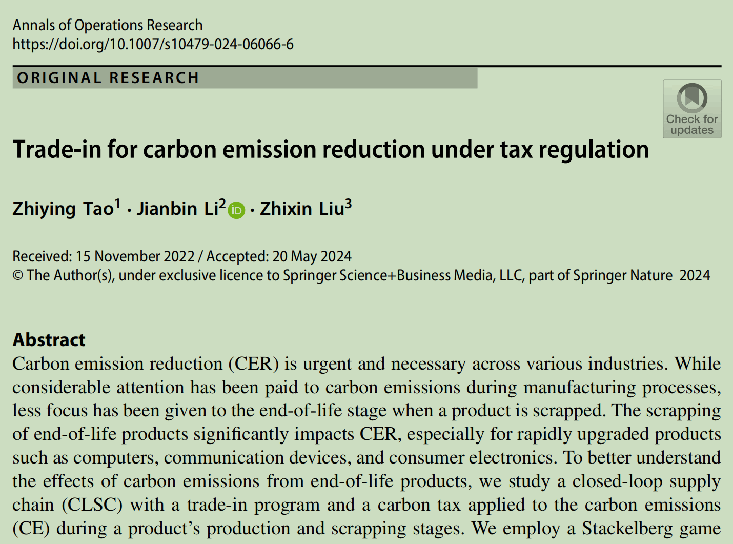 近期,管理学国际期刊《Annals of Operations Research》发表我校太阳集团网tyc9728陶智颖博士在低碳供应链运营管理相关领域取得的研究成果:“Trade-in for carbon emission reduction under tax regulation”(文章DOI:10.1007/s10479-024-06006-6)。太阳集团网tyc9728为该论文的第一作者单位。