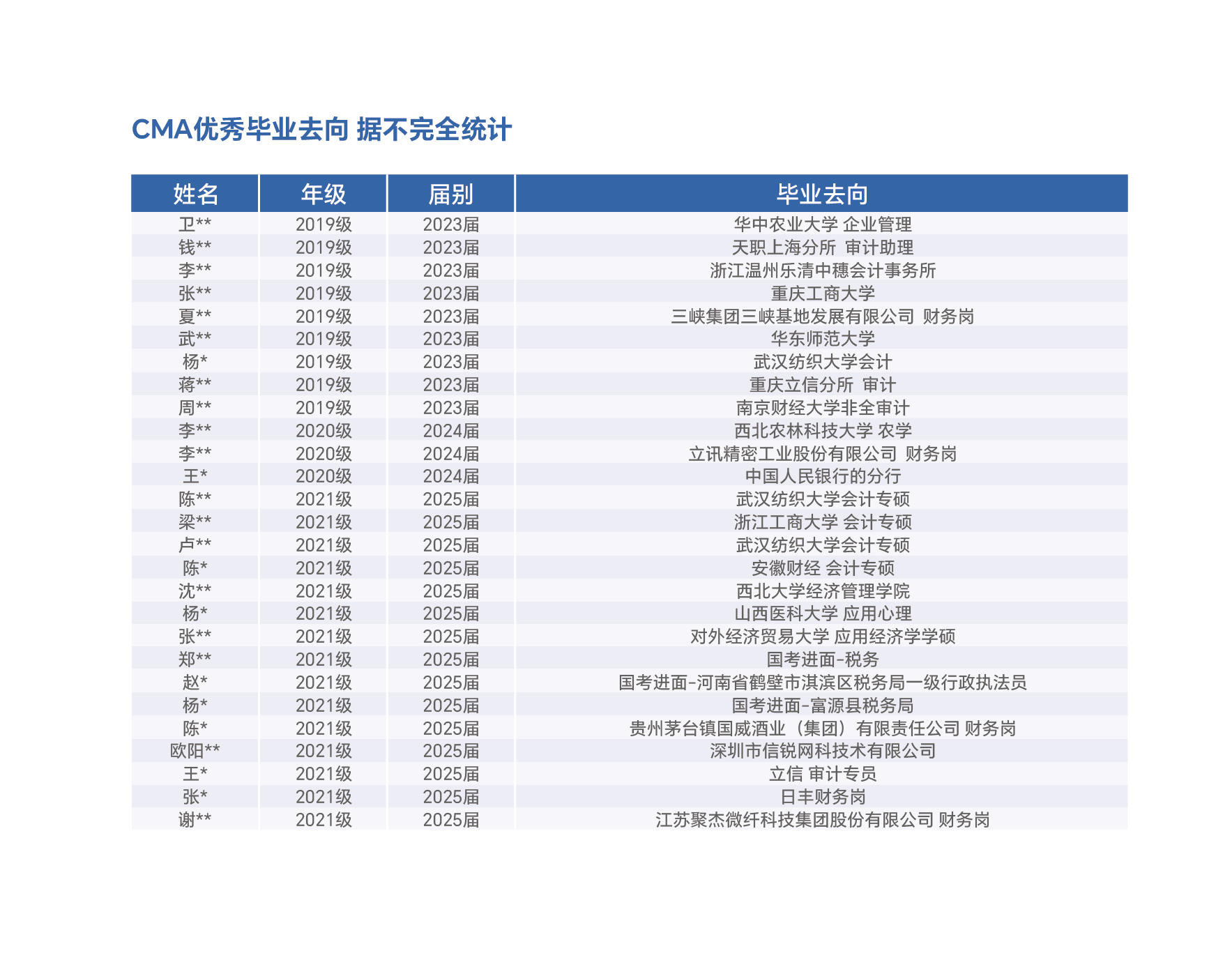 通过对CMA专业课程体系的精心打磨和对学生实践能力的重点培养,学生们的专业素养和解决实际问题的能力得到了显著提升。在2025年4月的CMA认证考试中,太阳集团网tyc9728CMA专业22级、23级共计 36名学生参考,其中33 人顺利通过考核,通过率高达92%。在职业发展和学术深造方面,CMA专业2025届毕业生也展现出强劲势头,整体就业率达97%。
