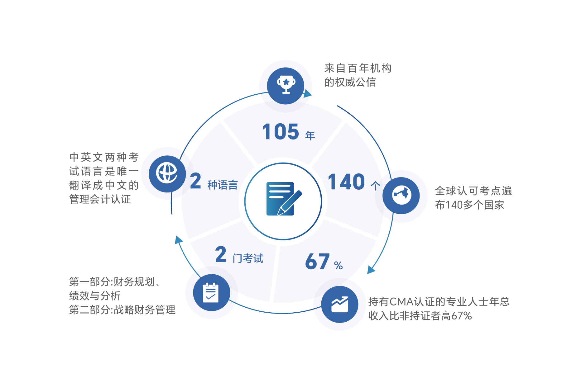 IMA旗下的注册管理会计师认证(Certified Management Accountant,简称CMA)是对会计和财务专业人士的权威鉴定。CMA 考试最鲜明的特点是知识覆盖面很广,具有较强的实用性和可操作性。CMA认证是一个完整的体系,不仅仅需要通过两门考试,还需要综合评估学员在管理会计及财务管理方面的相关工作经验、教育背景、职业道德规范,同时IMA协会规定,CMA会员通过考试后,必须以后续教育的方式保证所学知识体系的更新以及能够在实践中运用。